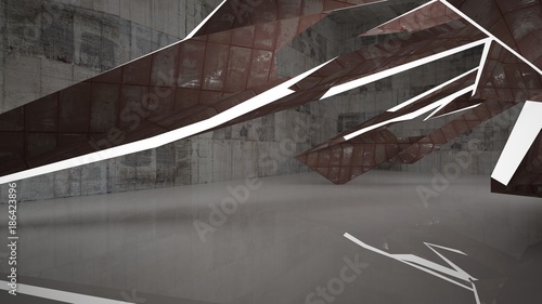Empty abstract room interior of sheets rusted metal and concrete. Architectural background. Night view of the illuminated. 3D illustration and rendering