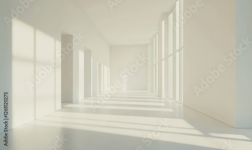 Empty art gallery with clean white walls and bright natural light streaming in, soft shadows adding depth, clean and elegant, perfect for modern themes