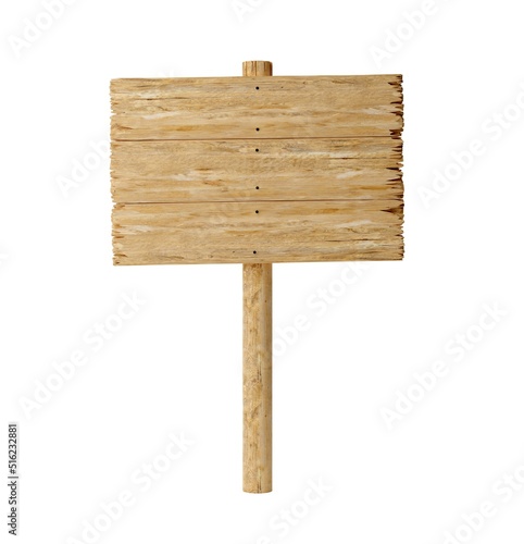 Empty, blank wooden sign from multiple boards on wood post with room for text, wooden board sign template isolated on white background