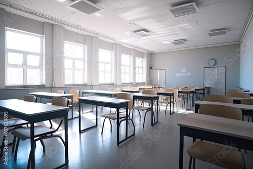 Empty classroom, Blurred school classroom without students with empty chairs and tables