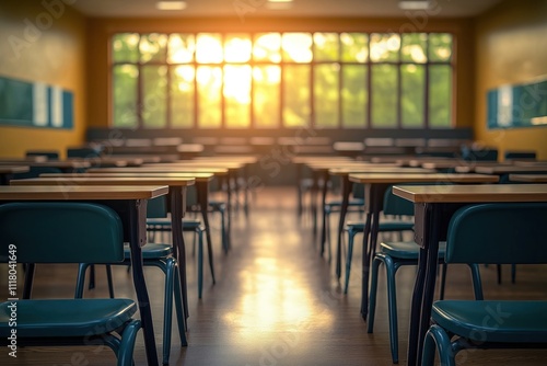 Empty classroom interior with rows of desks, chairs. Sunlight streams through large windows. Empty space suggests no students teachers present. Modern school environment with natural light.