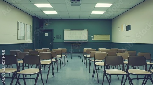 Empty Classroom with Chairs Arranged in Rows Facing a Whiteboard