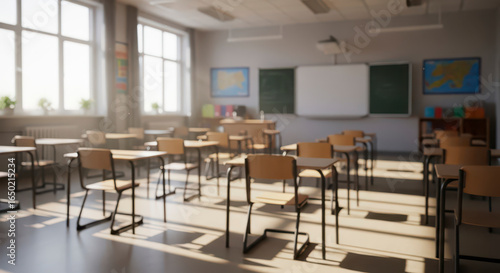Empty Classroom with Desks and Chairs Bathed in Sunlight