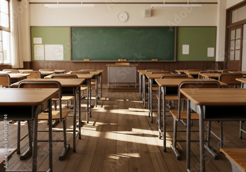 Empty classroom with desks and sunlight, ready for learning moments