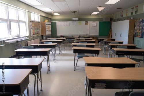 empty classroom, with student desks and chairs in their place, ready for the school year, created with generative ai