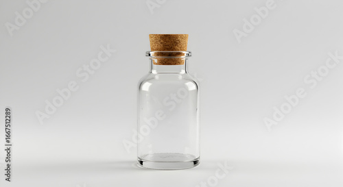 Empty Clear Glass Bottle with Cork Stopper on White Background