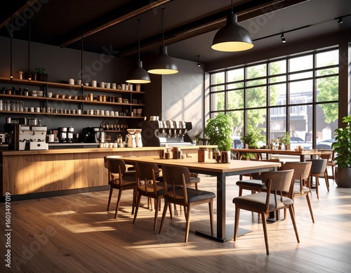 Empty Coffee Shop Interior With Wooden Tables, Coffee Maker, Dark Lights.