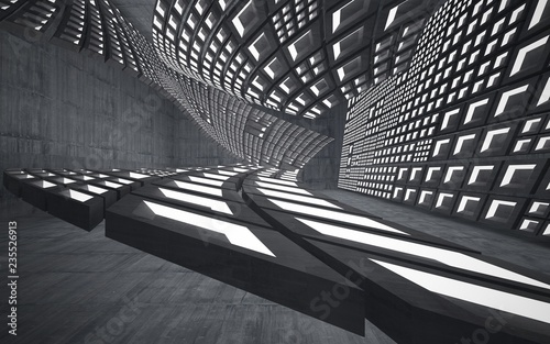 Empty dark abstract concrete room interior. Architectural background. Night view of the illuminated. 3D illustration and rendering