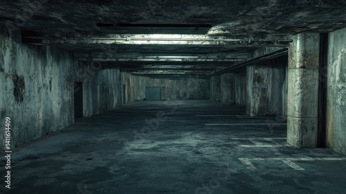 Empty, dark, decaying underground parking garage