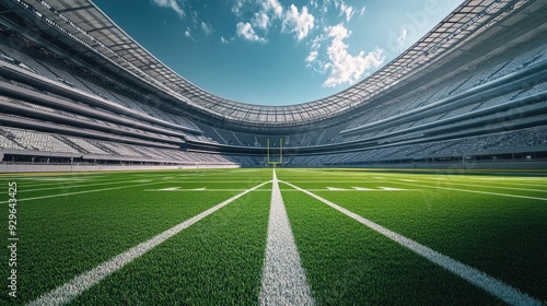 Empty football stadium captured from the center of the field, showing all stands with perfect symmetry.