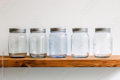 Empty glass jars on wooden shelf for eco-friendly storage solutions, promoting sustainable living, zero waste concept