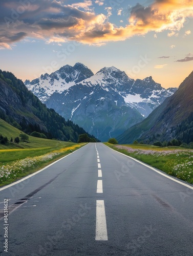 Empty highway in the middle of flowering meadows, steep mountain peaks in the background, sky illuminated by sunset rays, incredible nature