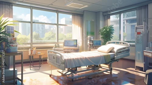 Empty hospital room with a bed, medical equipment, windows with city view, and sunlight.