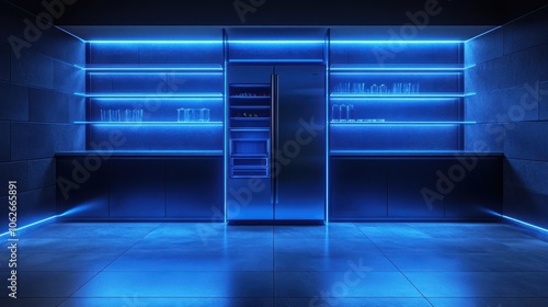 Empty illuminated refrigerator with glass shelves and blue lighting, showcasing spacious modern design for creative food storage