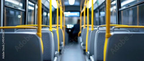 Empty Interior of Modern City Bus with Yellow Handrails