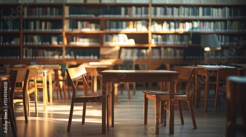 Empty library study room with wooden tables and chairs, sunlight streaming through the large bookshelves.