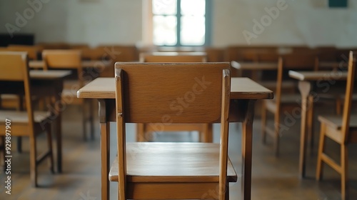 Empty Modern Classroom In the School Interior, Back to School Concept Book, Chair, table 3D Render.
