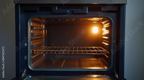 Empty modern electric oven with light turned on. New oven, front view, close up.