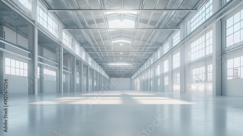 Empty modern warehouse interior, bright and spacious