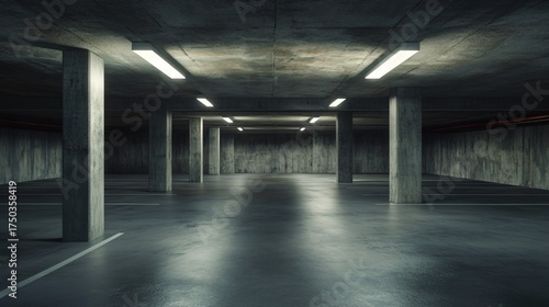 Empty parking garage interior with concrete pillars and fluorescent lighting.