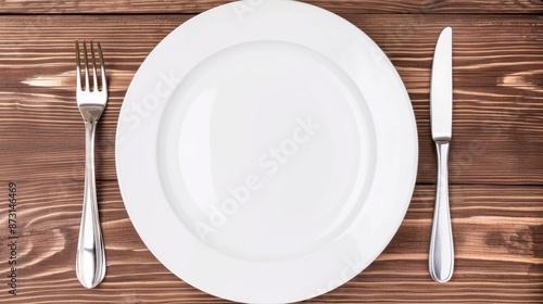 Empty plate and cutlery from top view, wooden background, isolated with studio lighting, clear and high-quality image, ideal for food advertising