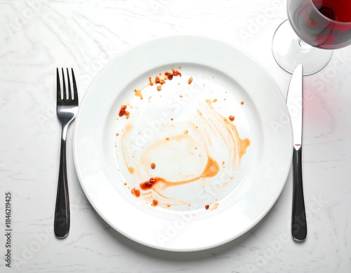 Empty plate with remnants of a delicious meal on marble table