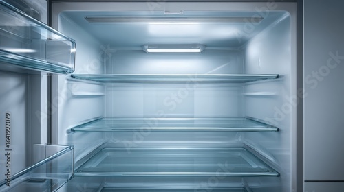 Empty Refrigerator Interior with Glass Shelves, Illuminated for Food Storage and Organization Concept