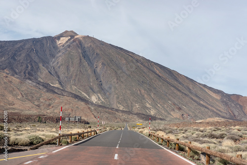 Empty road surrounded by the arid volcanic landscape with the majestic peak Mount Teide known locally as Pico del Teide in front in Las Canadas del Teide national park, Tenerife, Canary Islands, Spain