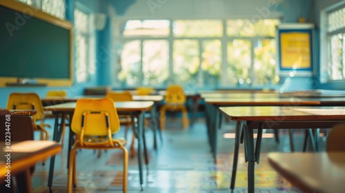 Empty school classroom without young student. Blurry view of elementary class room no kid or teacher with chairs and tables in campus