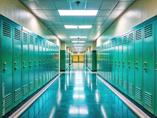 Empty School Hallway Teal Lockers - Bright, Sharp, American School Interior Photography
