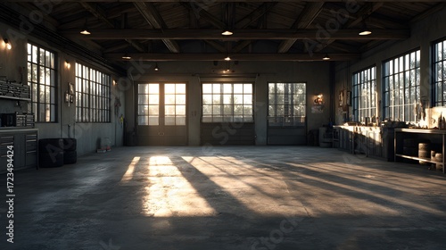 Empty, spacious auto repair garage with large windows letting in soft afternoon light, casting long shadows across the clean concrete floor.