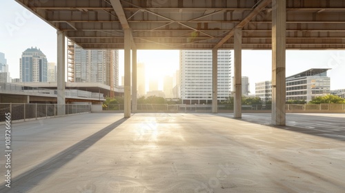 Empty square floor with city skyline background, Cityscape with architectural symmetry, geometric precision in urban design