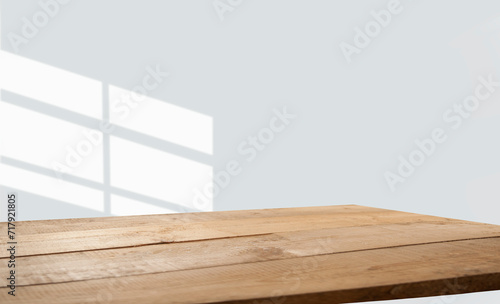 empty table with window shadow on light wall background for product mockup display. kitchen interior theme