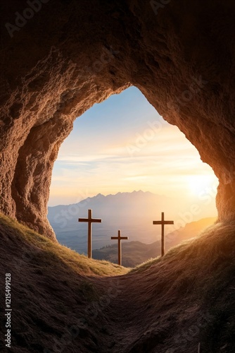 Empty tomb with three crosses on hill at sunrise. Resurrection Of Jesus Christ. Easter, Good Friday, Palm Sunday. Christian symbol, religious concept