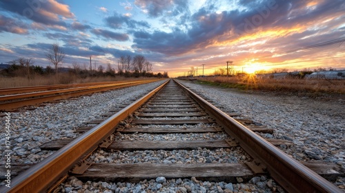 empty train tracks leading into horizon, golden sunset, hope and movement, simple and emotional