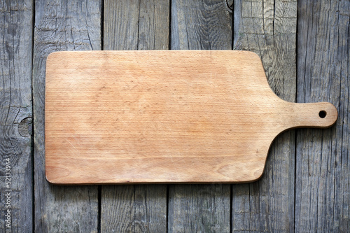 Empty vintage cutting board on planks food background concept