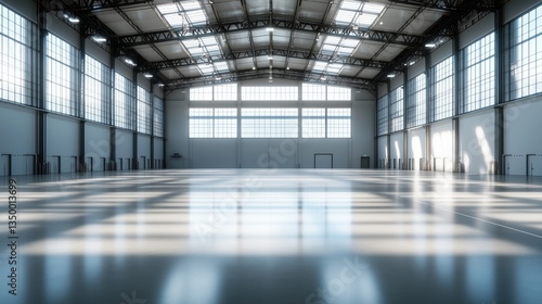 Empty warehouse with sunlight shining through windows and polished floor
