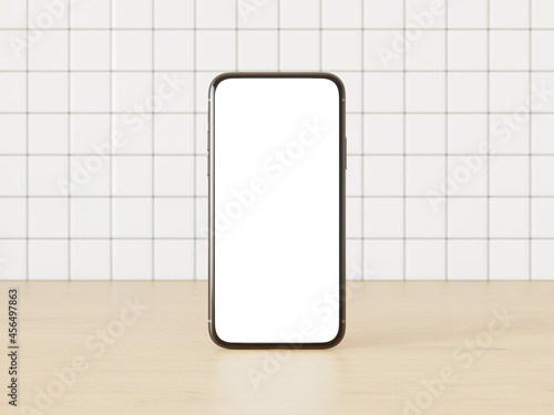 Empty white phone display for adding your content. Digital device against tiled wall background. 3D illustration.