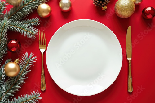 Empty white plate and Christmas decorations on red table Christmas menu concept Mock up