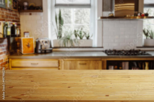 Empty Wood Table For Products Display With Blurred Old Style Kitchen Background