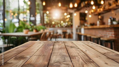 Empty wood table with blur interior coffee shop restaurant or cafe for background : Generative AI