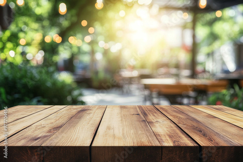 Empty wood table with blur interior outdoor space coffee restaurant or cafe for background