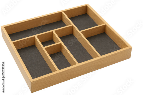 Empty wooden drawer organizer tray with transparent background