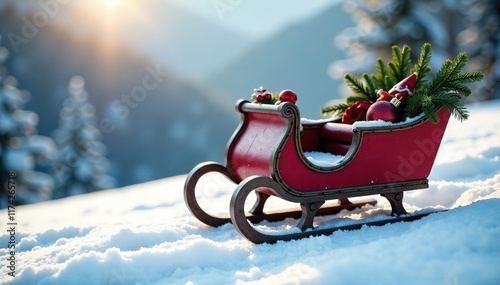 Empty wooden sled with Christmas decorations on a snowy hill, wood, snow