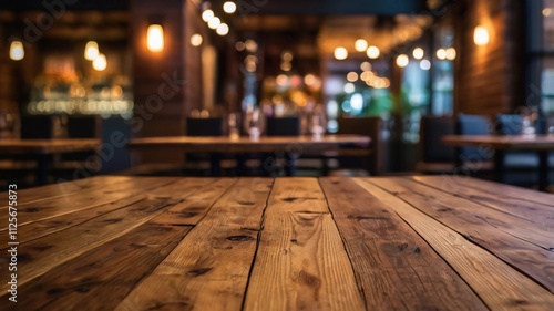 Empty wooden table in restaurant abstract bokeh background