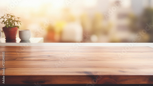 Empty wooden table top on blur cafe background with bokeh image. For product display