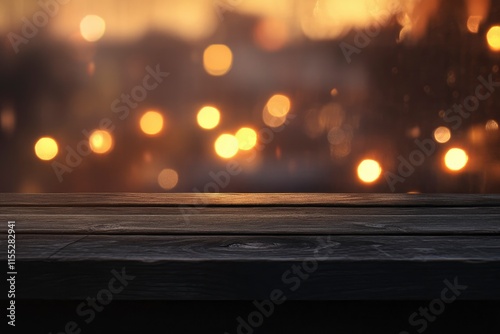 Empty wooden table top with lights bokeh on blur restaurant background.