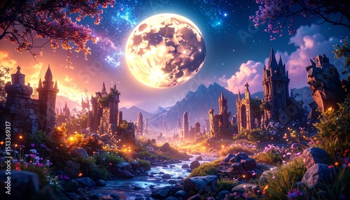 Enchanted Castle Under Moonlit Sky With Mountains and Flowing Stream
