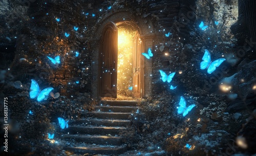 Enchanted Doorway with Glowing Light and Blue Butterflies Scene