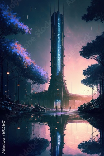 Enchanted elven tower amidst a futuristic and lush bioluminescent forest cityscape